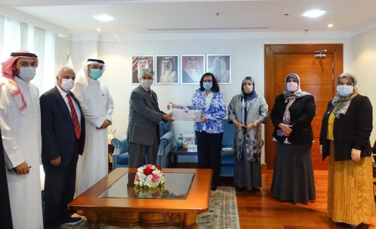 Manama, May 6 (BNA): Health Minister Faeqa bint Saeed Al Saleh received Secretary General of the Royal Humanitarian Foundation (RHF) Dr. Mustafa Al Sayed, the efforts coordinator in the national campaign “Feena Khair”, who presented her with 10,000 high quality, re-usable face masks that were produced by RHF in cooperation with the productive families affiliated with it.