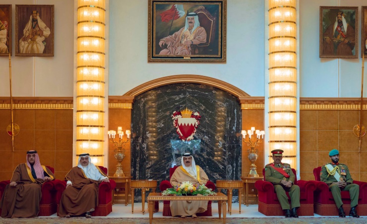 Manama, Feb. 6 (BNA): His Majesty King Hamad bin Isa Al Khalifa, the Supreme Commander, received, in the presence of His Royal Highness Prince Salman bin Hamad Al Khalifa, the Crown Prince, Deputy Supreme Commander and First Deputy Prime Minister, at the Al-Sakhir Palace today, the Commander-in-Chief of the Bahrain Defence Force (BDF), Field Marshal Shaikh Khalifa bin Ahmed Al Khalifa, alongside Defence Affairs Minister, Lieutenant-General Abdulla bin Hassan Al-Nuaimi, Chief of Staff, Lieutenant-General Dheyab bin Saqr Al-Nuaimi and a number of senior BDF officers, marking the BDF’s 52nd Anniversary. They extended deepest congratulations to HM the King on the BDF Day, lauding the constant royal support for the BDF, and praying to Allah the Almighty to protect HM King Hamad so as to continue the glorious march witnessed by the kingdom during his prosperous era. HM King Hamad expressed congratulations and appreciation to all BDF’s officers, non-commissioned officers and servicemen, as well as the citizens on the glorious national occasion. HM the King valued highly the efforts being exerted by the BDF affiliates to protect the kingdom’s achievements, safeguard the citizens’ security and defend national unity with competence, patriotism and authentic determination, stressing that they are the nation’s fortified shield and its source of pride. HM King Hamad affirmed that the BDF Day is a milestone in the kingdom’s history, and that it is advancing year after year thanks to the efforts of its brave personnel. The Supreme Commander stressed that the BDF not only carries out its patriotic duties of the defending the nation valiantly, but also contributes effectively to supporting the kingdom’s comprehensive development march in many fields, citing the distinguished health and housing services it delivers to the citizens. HM the King also highlighted the BDF’s distinguished achievements at the international level, citing the national military football team’s success in winning the seventh edition of the World CISM Military Games in the city of Wuhan, China. The Supreme Commander also praised the BDF’s positive contributions to international military shows, as well as distinguished participation in major national occasions, stressing that the BDF affiliates have always proved their competence and worth in various fields. HM King Hamad expressed thanks and appreciation to the BDF Commander-in-Chief, Field Marshal Shaikh Khalifa bin Ahmed Al Khalifa, for his unwavering efforts and sound leadership that have contributed to advancing the BDF, as well as to the braver BDF personnel for their keenness to carry out their duties with courage and dedication, paying tribute to all servicemen who have served the nation since the BDF’s establishment. HM King Hamad extended congratulations to all brave BDF servicemen who are carrying out their noble duties abroad in defence of justice and peace, in addition to delivering assistance and relief aid to brotherly countries, wishing everyone further success. HM the King, the Supreme Commander, was presented with a commemorative gift from HRH the Crown Prince, marking the 52nd BDF Day. HM King Hamad and HRH the Crown Prince were presented with commemorative gifts from the BDF Commander-in-Chief marking the same occasion.