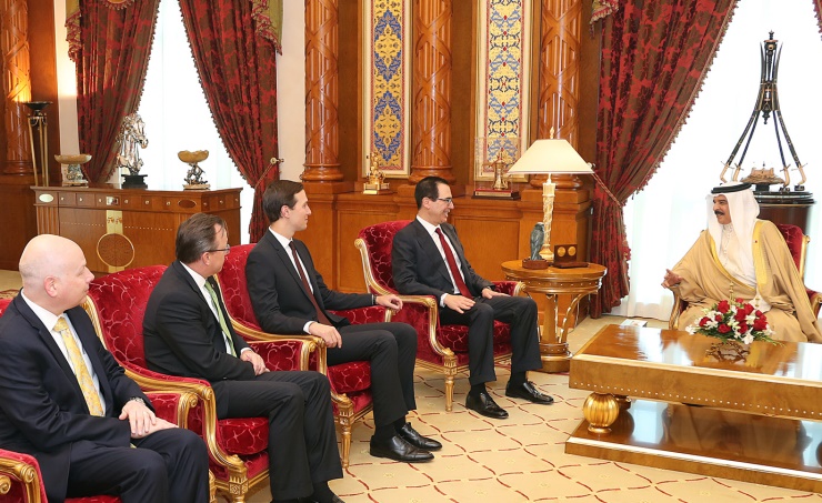 Manama, June 25 (BNA): His Majesty King Hamad bin Isa Al-Khalifa has today received at Gudaibiya Palace – in the presence of His Royal Highness Prince Salman bin Hamad Al-Khalifa, Crown Prince, Deputy Supreme Commander and First Deputy Premier – US Secretary of the Treasury Steven Mnuchin, US President’s Senior Advisor Jared Kushner, US President’s Middle East Special Envoy Jason Greenblatt and US Special Representative for Iran Brian Hook, marking their visit to the Kingdom of Bahrain to take part in the "Peace to Prosperity" economic workshop, being held in Manama.