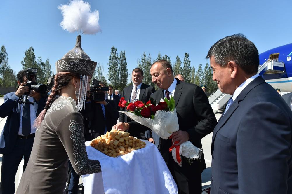 Baku, Azerbaijan, Sept.16 Trend: Azerbaijan’s President Ilham Aliyev arrived in Kyrgyzstan Sept.16 to take part in the meeting of CIS Council of Heads of State. A guard of honor was lined up for President Aliyev at Manas International Airport in Bishkek. President Aliyev was welcomed by Kyrgyzstan’s Prime Minister Sooronbay Jeenbekov and other high-raking state and government representatives.