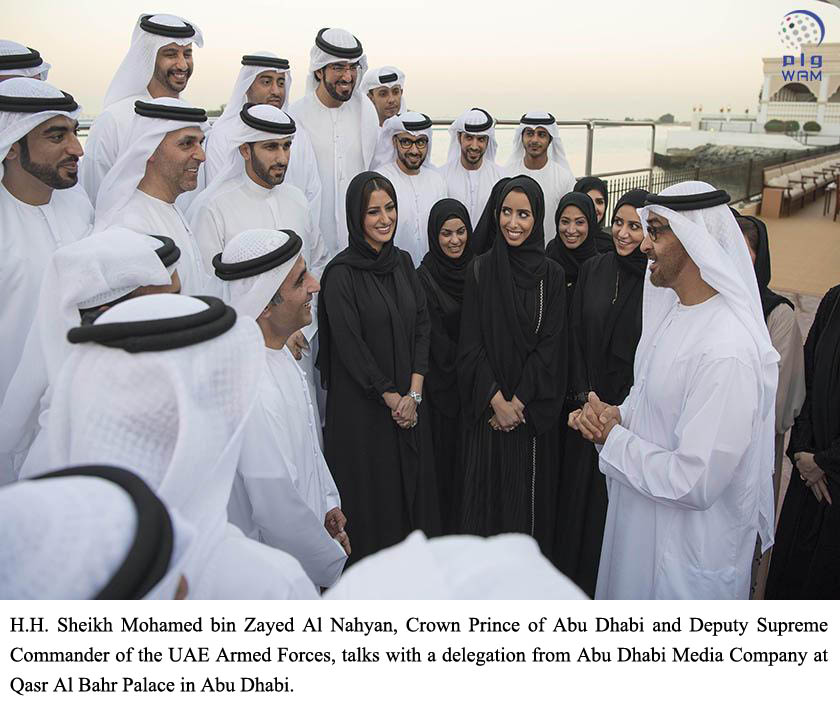 ABU DHABI, 27th December, 2016 (WAM) -- The UAE leadership is looking forward to a national media industry that lives up to the standards of achievements and rises to the challenges while keeping pace with modern technology to strengthen its mission, reflect the image of the country’s progress, and project and support the UAE’s regional and international causes, said His Highness Sheikh Mohamed bin Zayed Al Nahyan, Crown Prince of Abu Dhabi and Deputy Supreme Commander of the UAE Armed Forces. "Media organisations should also nurture and empower young talents to rise to the national responsibilities and contribute effectively towards development," he said while receiving a delegation from Abu Dhabi Media Company, led by Director-General Dr. Ali bin Tamim, at Qasr Al Bahr Palace. He underlined the vital role of media in supporting the overall development and achievements taking place in the UAE under the leadership of President His Highness Sheikh Khalifa bin Zayed Al Nahyan. "Media with a sense of responsibility can bring about positive changes in all spheres that are of interest to the members of the society. The sector serves as an important link between people and officials," he said. The media industry cannot achieve its set goals if it fails to offer sound content and form or fails to help strengthen the ties between generations and their past and present while leading them to the future, the Crown Prince of Abu Dhabi stressed. – Emirates News Agency, WAM - http://www.wam.ae/en/news/emirates/1395305156184.html