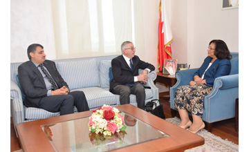 Manama, Mar. 4 (BNA): Health Minister Faeqa Saeed Al Saleh today received John G Magner, External Relations Official at Royal College of Physicians in Ireland - Bahrain, and his accompanying delegation.