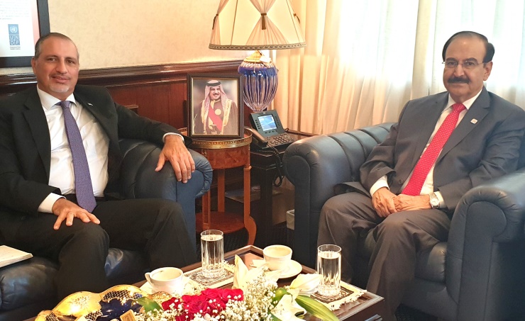 Manama, Mar. 13 (BNA): Electricity and Water Affairs Minister Dr. Abdulhussain Mirza received United Nations Resident Coordinator Amin Al-Sharqawi who congratulated him on Royal Decree 22/2019 setting up the Sustainable Energy Centre and assigning the minister to supervise it. Al-Sharqawi also congratulated the minister on the results achieved in the implementation of the National Renewable Energy Plan and the National Plan for Energy Efficiency. The minister said that the decree establishing the centre represents a major step that will put Bahrain on the map of countries that use renewable, clean and environmentally friendly energy. It will also support the achievement of the national goals set by the Council of Ministers under which five percent (5%) of energy use will be renewable by 2025. Al-Sharqawi said that the Royal Decree establishing the Sustainable Energy Center will be a real translation of the policies, initiatives and actions of the government's work programme and will achieve the seventh objective of sustainable development goals of ensuring universal and affordable access to modern, reliable and sustainable energy services by 2030. The objectives of the Center for Sustainable Energy would be at the heart of the Government's work programme, particularly in the area of environment and urban development, as well as in the theme of enhancing energy efficiency, improving efficiency and rationalizing consumption.