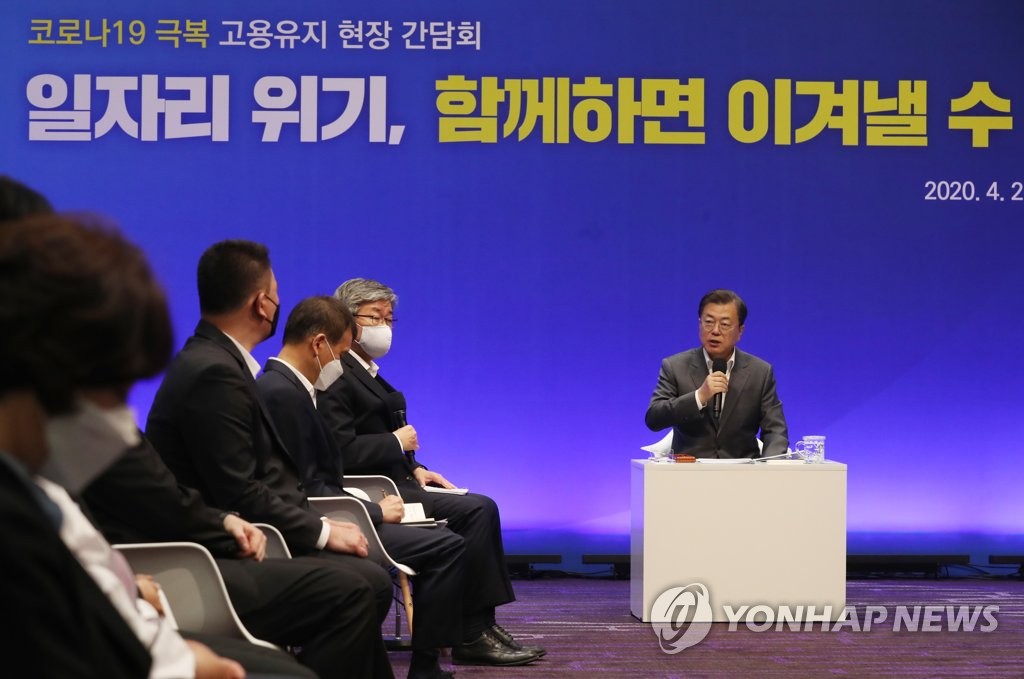 SEOUL, April 29 (Yonhap) -- President Moon Jae-in emphasized the need Wednesday for a win-win approach to keep job cuts at bay amid the prolonged coronavirus-led economic crisis, which he describes as the worst since the 1997 financial meltdown.