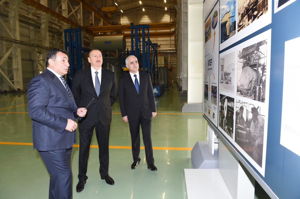 Head of ATEF Group of Companies Talib Alikhanbayov briefed the president on the company`s Baku oil transformer plant in Amirjan settlement, a transformer and electrical equipment plant in Garachukhur settlement and a metalware plant in Hovsan settlement.