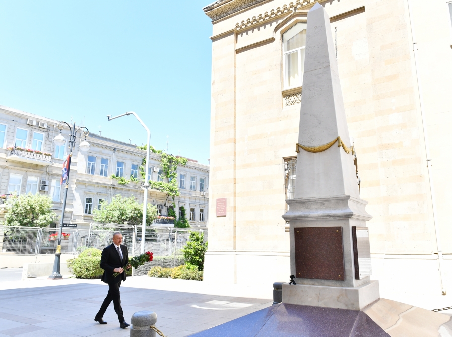 Baku, May 28, AZERTAC On May 28, President of the Republic of Azerbaijan Ilham Aliyev visited a monument to the Azerbaijan Democratic Republic in the Istiglaliyyat Street in Baku on the occasion of the Independence Day. The head of state laid flowers at the monument.