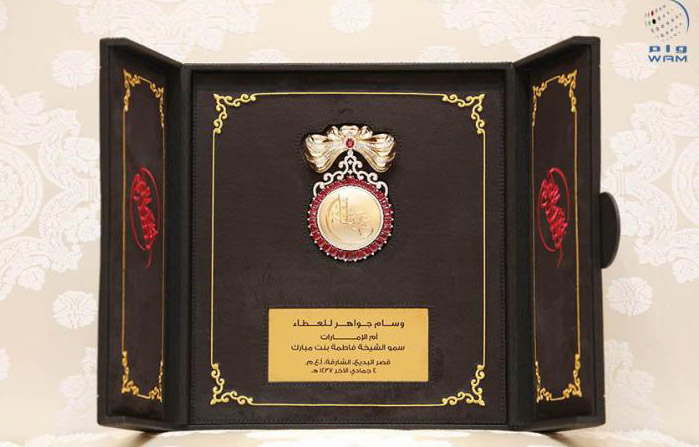 H.H. Sheikha Fatima Bint Mubarak, Chairwoman of the General Women's Union (GWU), Chairwoman of the Family Development Foundation (FDF) and President of the Supreme Council for Motherhood and Childhood, yesterday received the first edition of the ‘Jawaher Medal of Honour’ from H.H. Sheikha Jawaher bint Mohammed Al Qasimi, Wife of His Highness the Ruler of Sharjah and Chairperson of the Supreme Council for Family Affairs. The prestigious accolade was awarded in recognition of Sheikha Fatima's tremendous efforts and contributions to social and humanitarian issues, including her commitment to women’s empowerment, childhood care and family welfare, both in the UAE and across the globe. The honouring ceremony took place at Al Badea Palace in Sharjah in the presence of a number of female ministers, women’s leaders, members of the Federal National Council, prominent figures and heads of social and humanitarian organisations dedicated to women and children in the UAE. Commenting on the award, Sheikha Fatima bint Mubarak, said; "The Jawaher Medal of Honour is a gift to every Emirati woman who contributes to the development of her society and to sustaining the country's glory and excellence. This important approach that engages women in the nation’s development and progress was pioneered by the late Sheikh Zayed bin Sultan Al Nahyan, may God bless his soul, and continued by President His Highness Sheikh Khalifa bin Zayed Al Nahyan." Sheikha Fatima lauded the UAE’s wise leadership's appointment of eight women in the recent Cabinet, with a number of women now holding sovereign ministerial portfolios. Her Highness also outlined her belief in the virtues and importance of sacrificing one’s time and efforts for worthy causes. "The ability to give selflessly is an aspect of life that reflects the essential essence of humanity. The future will never be bright unless we unleash women's full capabilities and invest in their potential. In doing so, it is our duty to ensure the right conditions that will allow for family development and the protection for its members. We can look forward to a promising tomorrow if we truly appreciate human values and offer help to those in need, especially the victims of wars and natural disasters. I pay tribute to the selfless endeavours of all those who work to alleviate pressing global humanitarian issues and I thank Her Highness Sheikha Jawaher Al Qasimi for this recognition that I appreciate it greatly," Her Highness Sheikha Fatima added. Sheikha Jawaher Al Qasimi, said; "I congratulate the Mother of the Nation, Her Highness Sheikha Fatima bint Mubarak, on being awarded the prestigious Jawaher Medal of Honour. It gives me great pleasure that Her Highness is the first to be bestowed with this unique medal, which has been given to her in appreciation of Her Highness’ distinguished personality and her generous efforts towards worthy causes. Her Highness Sheikha Fatima has carved her name in the humanitarian field through her extensive contributions, which have marked her out as a role model for Emirati, Arab and women worldwide." She highlighted Her Highness Sheikha Fatima's belief in Emirati women and her support for their empowerment, which she facilitates by providing supportive legislation and ensuring appropriate conditions for their development. Her Highness said that Sheikha Fatima’s encouragement of women to pursue education and work, while also nurturing happy family lives, made the UAE a leading country in providing equal opportunities for women. This allows them to participate in public life and to create milestones that place the UAE among the world’s top countries. Sheikha Jawaher also praised Sheikha Fatima's contribution to development and the promotion of peace in fraternal and friendly states. During the ceremony, Sheikha Fatima received greetings and well-wishes from official figures and women leaders who were present, this was followed by a lunch banquet held in Her Highness’ honour at Al Badea Palace. A documentary film was shown during the honouring ceremony that featured Sheikha Fatima's history of humanitarian and charitable work. The occasion also drew attention to the sixth edition of the ‘Pink Caravan Ride,’ a pan-UAE awareness initiative organised by the Friends of Cancer Patients (FoCP), under the support and patronage of H.H. Sheikha Jawaher Al Qasimi. The Pink Caravan Ride is currently embarking on a 10-day journey across the UAE, which will be concluded on Thursday. The activity has the important aim of raising awareness about breast cancer and offering free examinations to both Emirati and residents men and women in the UAE. Sheikha Fatima's honour coincides with the 11th anniversary of her being named ‘The Mother of the Nation,’ an event that took place on March 21, 2005. The special occasion was held by the people of the UAE in appreciation of her significant efforts in supporting the late Sheikh Zayed bin Sultan Al Nahyan’s nation-building. Sheikha Fatima was deemed to be instrumental in strengthening the achievements of the country in many areas, notably education, women's empowerment, family stability and children's care and protection. She was recognised as having improved people's lives and stood by friendly nations in times of distress and hardship resulting from political unrest or natural disasters. Sheikha Fatima bint Mubarak has a rich portfolio of major milestones and initiatives that have made her a pioneering icon for women's and humanitarian work in the UAE. She has led the way in supporting women's empowerment and rights, thereby advancing their status. Sheikha Fatima’s tireless work is characterised by establishing associations, implementing initiatives and launching awards programmes that achieve a balance between modernity and the preservation of Islamic teachings and authentic Arab traditions. In 1973, Sheikha Fatima established the Abu Dhabi Women Development Association as the first wom