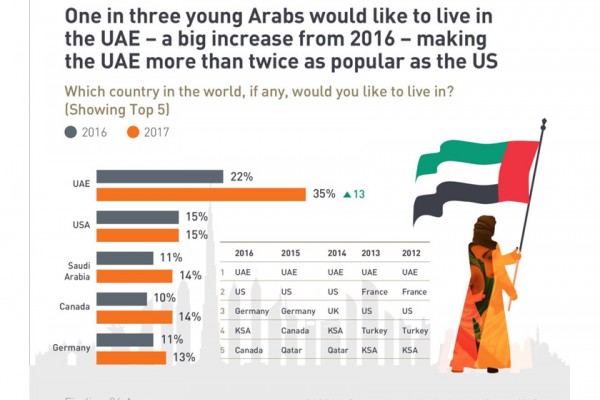 With a significant increase in the nation's popularity compared to previous years, the findings of the ninth annual ASDA'A Burson-Marsteller Arab Youth Survey 2017, have kept the UAE for the sixth year on a row at the pinnacle of choices for young Arabs to live in, with 35 percent of young Arabs surveyed, citing the UAE as their first and foremost preference, a significant increase of 13 percent points over last year.