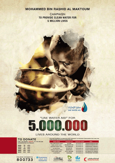 For this year’s Initiative, the Holy Month of Ramadan sees the U.A.E. Suqia (charity drinking water) project launched by His Highness Sheikh Mohammed, with a mission to provide clean drinking water to approximately five million people worldwide, in cooperation with the Emirates Red Crescent, U.A.E. Embassies abroad and other charity organisations. It is estimated that, worldwide, 4500 children die every day as a result of water-related illnesses. The U.A.E. Suqia Initiative will be implemented through digging wells, the provision of water pumps and water purification equipment to needy areas.