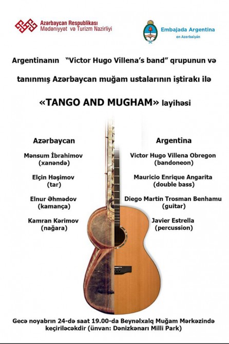 Baku, November 14, AZERTAC Azerbaijani and Argentine musicians will give a joint concert in Baku on November 24. Part of Tango and Mugham project, the concert will be co-organized by Azerbaijan`s Culture and Tourism Ministry and the Embassy of Argentina. It will feature performance of Argentina's Victor Hugo Villena's band and Azerbaijani mugham masters.
