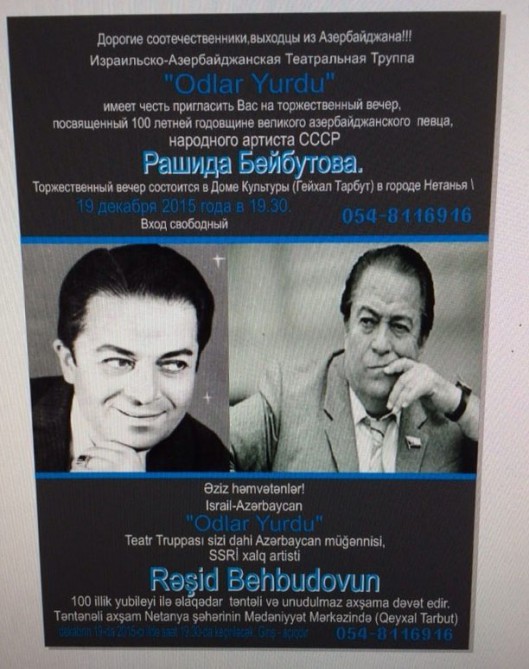 Baku, November 30, AZERTAC The 100th anniversary of Azerbaijani singer Rashid Behbudov’s will be marked in Netanya, Israel, on December 19. As part of Rashid Behbudov-100 event, the Israeli-Azerbaijani drama troupe Odlar Yurdu will perform at Heichal Hatarbut. Rashid Behbudov was an Azerbaijani singer and actor. His combination of vocal masterpieces ranged from classical performances to lyrical songs. Behbudov's rare vocal talent gave him opportunity to travel beyond the "Iron Curtain" of the Soviet Union, and as a singer he toured with concert performances in several countries of the world, including Iran, Turkey, China, India, Japan, Argentina, and many other countries in Europe, Asia and Latin America. Rashid was not just a pop singer. He could handle extremely complicated opera roles as well which he proved in the portrayal of Balash in Fikrat Amirov's opera "Sevil" ( 1953).