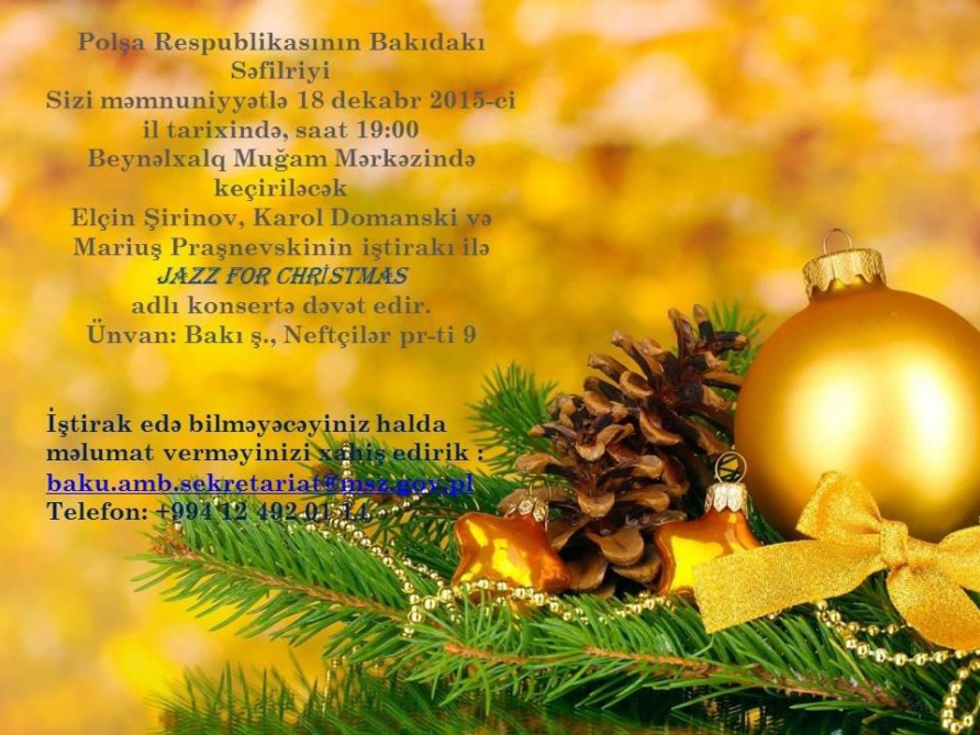 The International Mugham Center will host a concert of Azerbaijani and Polish musicians on December 7. The concert, titled Jazz for Christmas, will feature performance of Elchin Shirinov, Karol Domanski and Mariusz Prasniewski. The concert is organized by the Embassy of Poland to Azerbaijan.