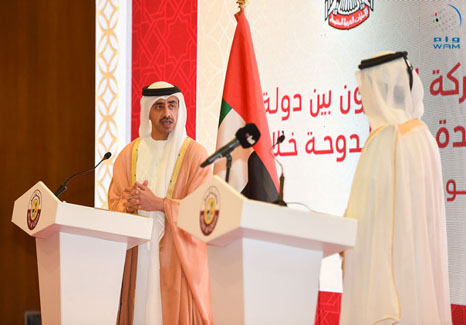 Speaking about challenges facing the region, the UAE minister said, ''They can't be isolated from the overall challenges we are currently facing. For that, the UAE and Qatar are working together under the GCC or Arab League umbrella to address them.'' Regarding Qatar's nomination for the post of director general of the UNESCO, H.H. said, ''Mutual support is always there, whether at the bilateral level or within the GCC, which issued a statement supporting the Qatari nominee.'' Turning to the latest developments in Syria, Sheikh Abdullah said, ''Both Doha and Abu Dhabi have issued statements regarding the situation in Syria, affirming that the dispute can't be solved through statements and there is an urgent need for action given the tragic situation that requires serious action on the part of the UN Security Council and the Vienna Group.'' H.H. affirmed that challenges facing the region - including terrorism - couldn't be addressed without solving political problems in Damascus and Baghdad.