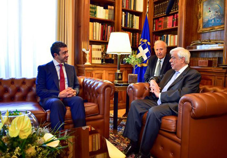 ATHENS, 14th July, 2016 (WAM) -- The President of the Hellenic Republic, Prokopios Pavlopoulos, yesterday received H.H. Sheikh Abdullah bin Zayed Al Nahyan, Minister of Foreign Affairs and International Cooperation, and his accompanying delegation, at the Presidential Palace in the Greek capital, Athens. During the meeting, H.H. Sheikh Abdullah bin Zayed conveyed the greetings of President His Highness Sheikh Khalifa bin Zayed Al Nahyan to the Greek President, wishing Greece and its people further progress and prosperity. Sheikh Abdullah also highlighted the importance of bilateral relations between the two countries and ways of enhancing them in various fields, including the need to promote economic relations, especially in the fields of energy and investment. The Greek President reciprocated his greetings to President His Highness Sheikh Khalifa, stressing his country's keenness to strengthen its relations with the UAE, given the outstanding position it has reached. During the meeting, the two sides also reviewed bilateral relations between the two countries and ways of enhancing them, as well as a number of issues of common interest. The meeting was attended by Sultan Mohammed Majid Al Ali, UAE Ambassador to Greece. - Emirates News Agency, WAM – http://www.wam.ae/en/news/emirates/1395297719773.html