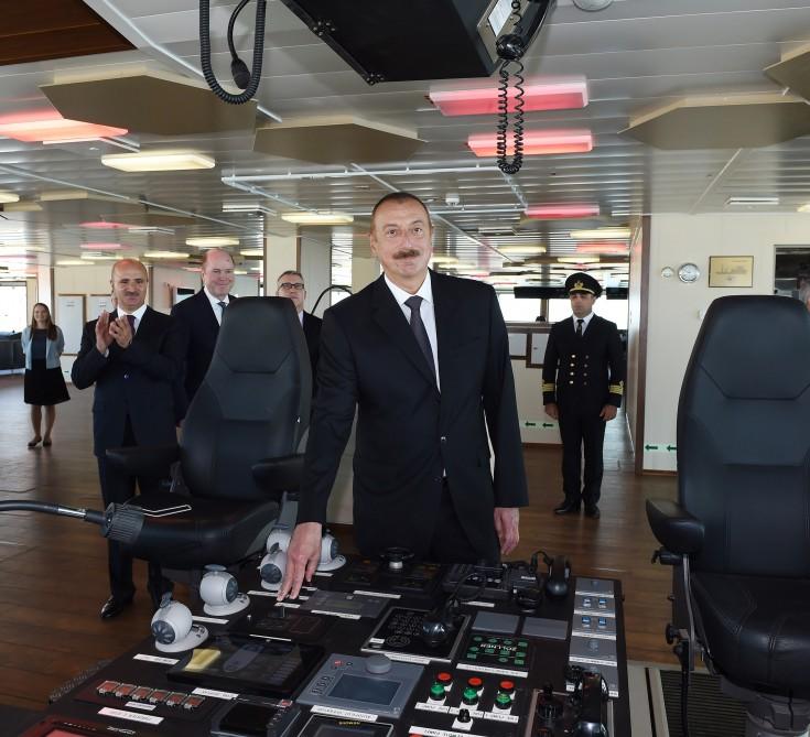Ilham Aliyev attends launch of Khankendi subsea construction vessel