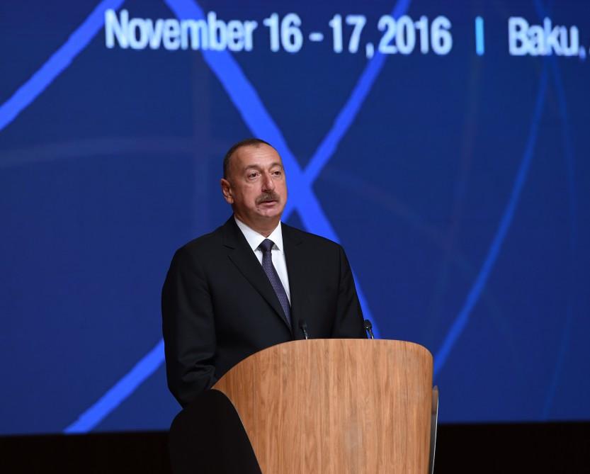 Baku, Azerbaijan, Nov. 16 By Seymur Aliyev - Trend: The 5th News Agencies World Congress, the 16th General Assembly of the Organization of Asia-Pacific News Agencies (OANA) and the 22nd session of the Council of CIS Heads of News Agencies have kicked off in the Heydar Aliyev Center in Baku. Addressing the opening ceremony, Azerbaijani President Ilham Aliyev noted that almost two hundred guests from 80 countries representing more than hundred of the world's leading news agencies from five continents, have gathered in Baku, for the 5th World News Agencies Congress. "This is a big honor for us to host this important global international event, and I am sure that our guests will not only discuss the important issues on the agenda, but also know more about Azerbaijan, see the development of the country," said the president. He added that the country is modern, dynamic and which has great potential for the future. "We consider hosting this event in Azerbaijan also a sign of appreciation of the activity and achievements of Azerbaijan in the development of independent media," the president said. "This is one of the priorities for our government." "I think that the achievements during the 25 years of independence show that we managed to provide freedom of media, as well as all other fundamental freedoms," said the president. "Today, in Azerbaijan there are almost fourty daily, more than two hundred weekly and monthly newspapers, ten nationwide, one satellite, thirteen regional, seventeen cable TV," he said. President Aliyev added that Azerbaijan is a country with completely free Internet, and more than 75 percent of population are internet users. He added that the population of the country is close to ten million, and there are two million social media users in Azerbaijan. "So these figures show that development of free media in Azerbaijan was very successful, we achieved our goal and one of the areas of transformation for our country during these 25 years, along with political and economic reforms, was the area of reforms in democratic development," Ilham Aliyev said. "Last month we celebrated the 25th anniversary of restoration of our independence. Restoration, because the first democratic republic of Azerbaijan was established almost a hundred years ago in 1918," said the president.