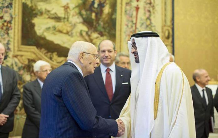ROME: His Highness General Sheikh Mohamed bin Zayed Al Nahyan, Crown Prince of Abu Dhabi and Deputy Supreme Commander of the U.A.E. Armed Forces, discussed with President of the Italian Republic, Giorgio Napolitano, the bilateral relations and ways to enhance them. The two sides also discussed other issues of mutual interest. Napolitano received Sheikh Mohamed and his accompanying delegation at the Quirinal Palace "Palazzo del Quirinale." Upon his arrival to the Palace, Sheikh Mohamed was accorded an official reception, inspected a guard of honour and shook hands with the Italian President and his accompanying official delegation. Giorgio Napolitano welcomed Sheikh Mohamed's visit, expressing his happiness at meeting him in order to discuss ways to support joint work in the light of the developments in bilateral relations in all domains. The Abu Dhabi Crown Prince conveyed the greetings of President His Highness Sheikh Khalifa bin Zayed Al Nahyan to the Italian President, and his best wishes of further progress and welfare to the Italian people. H.H. Sheikh Abdullah bin Zayed Al Nahyan, Foreign Minister attended the meeting. The two sides also reviewed the existing cooperation in various fields and discussed the importance to boost these in order to fulfil the aspirations of the two friendly peoples, especially in the economic, investment, trade, cultural and air transport fields. Sheikh Mohamed expressed his happiness at visiting Italy and said he was satisfied with the level of friendship and cooperation between the two countries in various political, economic, trade and cultural fields, noting that exchanging bilateral visits is one of the prime factors in ensuring continuous development of the relationship. He added that the U.A.E. and Italy have the potential for establishing partnerships at the multiple levels for the benefit of both sides, pointing out the importance of exchanging constructive ideas to boost bilateral relations and open horizons of further development. "We are happy to meet you Mr President in order to work together to enhance cooperation to the advantage of our countries as well as exchanging ideas with you to bolster the existing relations between us, evolving into a better future." On his part, the Italian President expressed satisfaction at the development of relations between his country and the U.A.E., which enjoys a good reputation at the international level, in addition to its sophisticated economic capabilities and pioneering initiatives in the developmental and humanitarian domains. He also wished that the relations would witness more constructive co-operation and continuous co-ordination for the benefit of the two countries and the world. He also tackled the issue of Italy hosting the Expo Milano 2015 and the U.A.E.'s successful bid to host Dubai Expo 2020, discussing the two countries' capabilities to host these international events, co-operation and co-ordination opportunities between the two sides, as well as ways to derive benefit from the joint expertise and capabilities to make the events successful. Sheikh Mohamed and Giorgio Napolitano commended the agreement signed between Etihad Airways and Alitalia last August to enhance capabilities of Alitalia and its competitiveness in the global aviation market. The Italian President asked Sheikh Mohamed to convey his greetings to President His Highness Sheikh Khalifa bin Zayed Al Nahyan and wished further progress and welfare to the people of the U.A.E. During the meeting, they exchanged views on various international developments and issues of mutual concern. At the end of the meeting, the two sides expressed their willingness to continue enhancing the existing friendship and co-operation in areas of common interest, in addition to having better ties at all levels. Among those who attended the meeting were Mohammed Ahmad Al Bawardi Al Falasi, Under-Secretary of the Ministry of Defence; Khaldoon Khalifa Al Mubarak, Chairman of Abu Dhabi Executive Affairs Authority (EAA); Saqr Nasser Al Raisi, U.A.E.'s Ambassador to Italy; and Mohammed Mubarak Al Mazrouei, Under-Secretary of the Abu Dhabi Crown Prince's Court. From the Italian side were, apart from Prime Minister Matteo Renzi, Italian Deputy Minister of Foreign Affairs Labu Bastyli; Italian Ambassador to the U.A.E. Giorgio Starace and a number of advisors of the Italian President. – Emirates News Agency, WAM