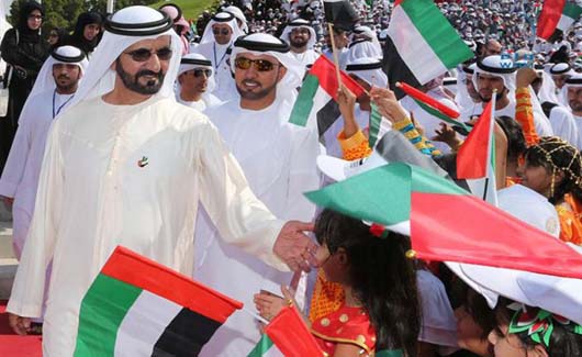 DUBAI, 4th November, 2015 (WAM) – His Highness Sheikh Mohammed bin Rashid Al Maktoum, Vice President and Prime Minister and Ruler of Dubai, yesterday hoisted the UAE National Flag at noon in the Dubai Creek Park, with the participation of 5,000 students from Dubai schools, representing more than 100 nationalities, in celebration of the UAE Flag Day. Flag Day, which is celebrated on 3rd November, also coincides with the anniversary of President His Highness Sheikh Khalifa bin Zayed Al Nahyan’s accession to the Presidency of the country. Speaking on the occasion, His Highness Sheikh Mohammed stressed the importance of the event in symbolising national values and fuelling the spirit of loyalty for the country. "It reminds us of our duty towards our country and our commitment to the flag, to do what we can to keep it flying in pride and dignity, motivate us to further our work and diligence in the glory of our country, and always maintain its position among the ranks of the greatest countries," he said Sheikh Mohammed said, "I gave directions for our national flag to be raised today at the same time, and in doing so I wanted to emphasise the important fact that we are all one in the UAE, we confirm our belonging to one nation, work to achieve the one goal which is glory, and consolidate our loyalty to the leader of the march of development, President His Highness Sheikh Khalifa bin Zayed Al Nahyan, promising Allah Almighty to forever keep our flag always flown high in pride of our country and the unity of its people." He added, "We know that our union is a symbol of strength and unity, and it is our duty to keep it a towering beacon of our dignity among nations." Addressing the children participating in the event, the Ruler of Dubai said, "You are the future and who will shape the future. Celebrating Flag Day is not only by using your hands but by using your mind's ideas and creativity." The celebrations at the creek park also featured the playing of the unified national anthem which was recently approved by His Highness Sheikh Mohammed with the aim to strengthen government identification at all federal and local authorities in line with the state identity in various activities and official events. Mohammed bin Abdullah Al Gergawi, Minister for Cabinet Affairs, and a number of other senior officials attended the event. – Emirates News Agency, WAM - http://www.wam.ae/en/news/emirates/1395287501650.html