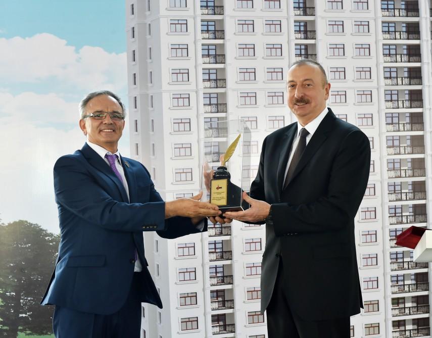 The award was presented to the president by Aflatun Amashov, chairman of the Azerbaijani Press Council, at the ceremony of presenting apartments to journalists on the occasion of the National Press Day in another building built for journalists.