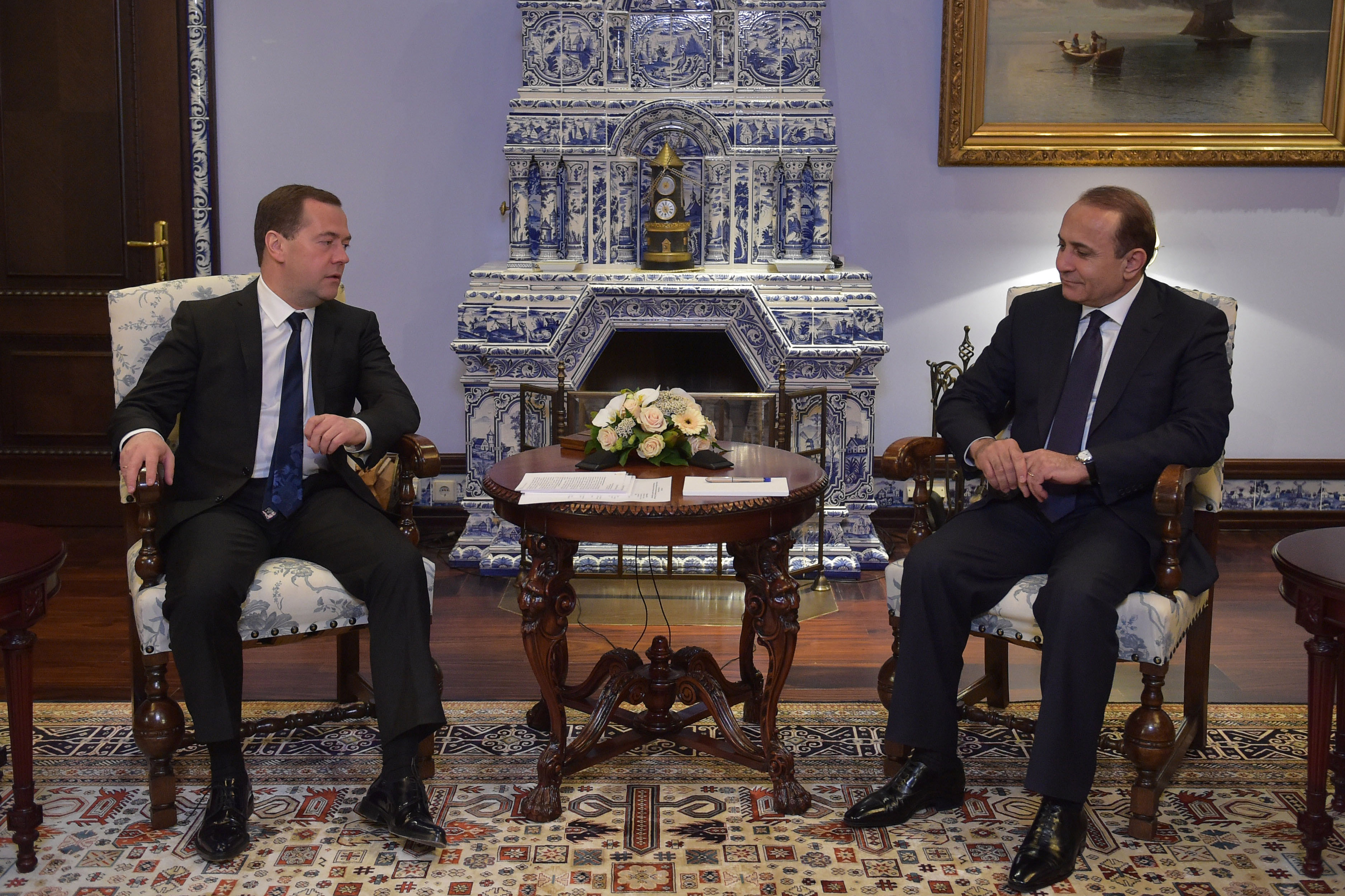 GORKI, February 5. /TASS/. In view of the forthcoming meeting of the Eurasian Economic Union’s inter-government commission at the head-of-government level, due Friday, the prime ministers of Russia and Armenia have discussed the bilateral agenda and integration cooperation. "This is our first meeting since Armenia has joined our integration project, the Eurasian Economic Union, I mean," Russian Prime Minister Dmitry Medvedev said at a meeting with his Armenian counterpart Ovik Abramian. In 2014 Russian-Armenian trade went up 3.2 percent on the year to 1.5 billion dollars. Russia is the largest foreign investor into the Armenian economy. Its accrued foreign investment stands at about 3.4 billion dollars. On the list of the largest investment projects is Gazprom’s participation in the construction of gas-fuelled power supply facilities, Russian mobile operator Vimpelcom’s acquisition of all assets of the national communications operator Armentel, and Vneshtorgbank’s acquisition of one of Armenia’s largest banks, Arsberbank, as well as efforts by the Russian Aluminum company to upgrade the Rusal Armenal smelter and the Inter RAO UES project to upgrade the Sevan-Razdan cascade of hydropower plants. Read more