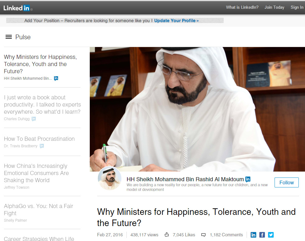 According to LinkedIn data, his recent Influencer post, in the form of an open letter and titled "Why Ministers for Happiness, Tolerance, Youth and the Future?", is on the top 3 most engaging posts globally from a political figure on LinkedIn’s Influencer platform. In addition, it is currently one of the 10 fastest growing influencer blog posts globally in terms of engagement, on LinkedIn.