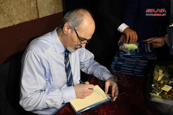 Damascus, SANA- Wrapping up its activities held recently at al-Assad National Library in Damascus, the Syrian Book Fair celebrated the signing of the book “Syrian Foreign Policy” for Syrian veteran diplomat Deputy Foreign and Expatriates Minister Bashar al-Jaafari in presence of official, diplomatic and cultural figures and others.