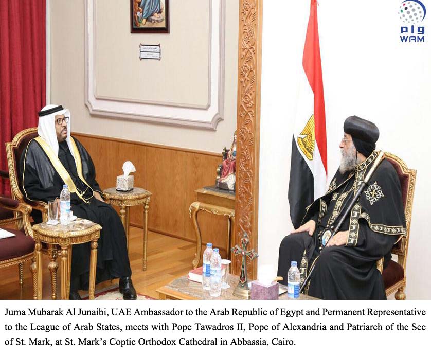 CAIRO, 27th December, 2016 (WAM) -- Juma Mubarak Al Junaibi, UAE Ambassador to the Arab Republic of Egypt and Permanent Representative to the League of Arab States, met Pope Tawadros II, Pope of Alexandria and Patriarch of the See of St. Mark, at St. Mark’s Coptic Orthodox Cathedral located in Abbassia, Cairo.