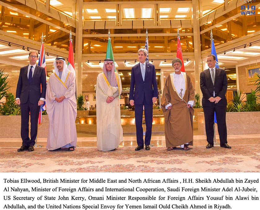 The meeting was also attended by US Secretary of State John Kerry, Saudi Foreign Minister Adel Al-Jubeir, British Minister for Middle East and North African Affairs Tobias Ellwood, Omani Minister Responsible for Foreign Affairs Yousuf bin Alawi bin Abdullah, and the United Nations Special Envoy for Yemen Ismail Ould Cheikh Ahmed.