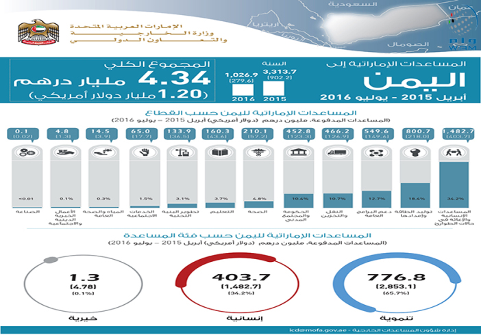 ABU DHABI, 11th August, 2016 (WAM) – The UAE offered AED4.34 billion (US$1.2 billion) in foreign aid to Yemen from April 2015 to July 2016 as part of its humanitarian and development aid to support the Yemeni people and its ongoing efforts to lay down the foundations for development, security, stability and peace in the Arab Republic of Yemen.