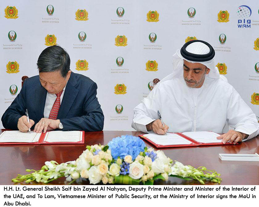 ABU DHABI, 3rd November, 2016 (WAM)-- The UAE and Vietnam on Wednesday signed a memorandum of understanding to bolster co-operation, co-ordination in preventing and combating all forms of crime and enhance their exchange of information, expertise and practices in police training. The agreement was signed by H.H. Lt. General Sheikh Saif bin Zayed Al Nahyan, Deputy Prime Minister and Minister of the Interior of the UAE, and To Lam, Vietnamese Minister of Public Security, at the Ministry of Interior. A number of issues of common concern and ways of enhancing relations between the UAE Ministry of Interior and the Vietnamese Ministry of Public Security were also discussed by the two ministers during an earlier meeting yesterday. A number of senior UAE and Vietnamese officers attended the signing ceremony and the meeting. – Emirates News Agency, WAM -http://www.wam.ae/en/news/emirates/1395302494626.html