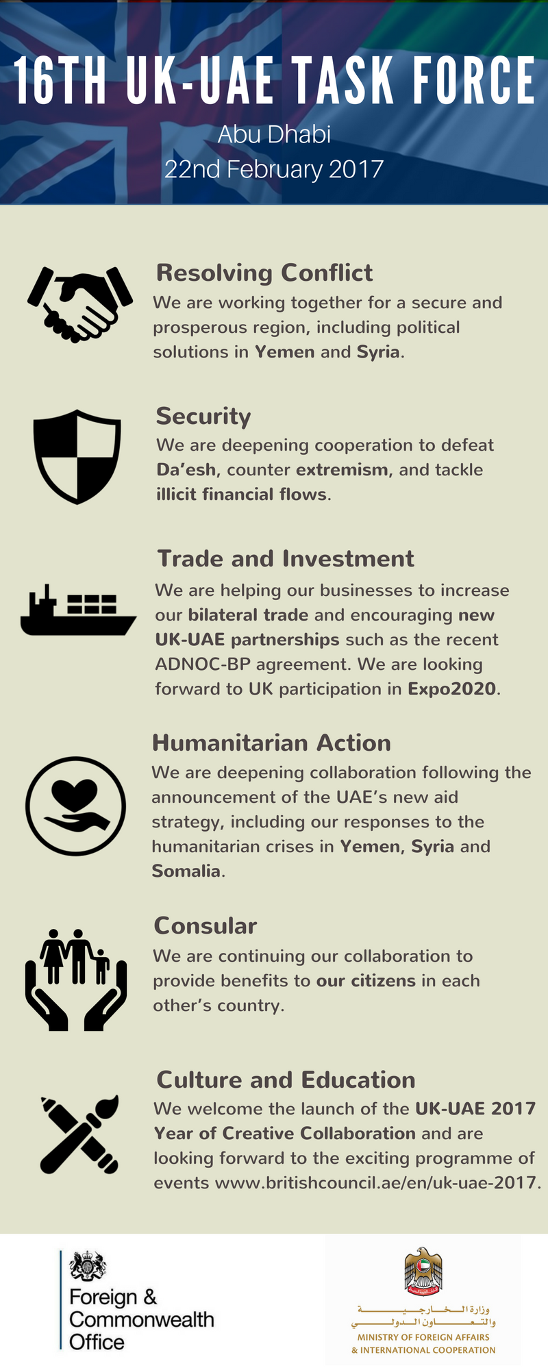 ABU DHABI, 23rd February, 2017 (WAM) -- The UK-UAE Task Force today held its 16th meeting in Abu Dhabi to discuss a range of issues of common interest, including conflict resolution, security, trade, investment, humanitarian action, education, culture and consular affairs. The Task Force issued the following statement: "16th UK-UAE Task Force. Abu Dhabi, 22nd February, 2017. Resolving Conflict We are working together for a secure and prosperous region, including political solutions in Yemen and Syria. Security We are deepening cooperation to defeat Daesh, counter extremism, and tackle illicit financial flows. Trade and Investment We are helping our businesses to increase Our bilateral trade and encouraging new UK-UAE partnerships such as the recent ADNOC-BP agreement. We are looking forward to UK participation in Expo2020. Humanitarian Action We are deepening collaboration following the announcement of the UAE's new aid strategy, including our responses to the humanitarian crises in Yemen, Syria and Somalia. Consular We are continuing our collaboration to provide benefits to our citizens in each other's country. Culture and Education We welcome the launch of the UK-UAE 2017 Year of Creative Collaboration and are looking forward to the exciting programme of events: www.britishcouncil.ae/en/uk-uae-2017." http://wam.ae/en/details/1395302599351