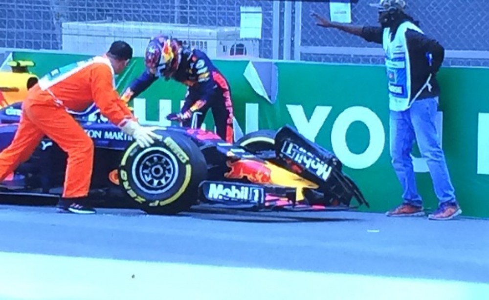 Red Bull`s Max Verstappen has got out at Turn 6 after his car crashed into barrier in the first practice of Azerbaijan Grand Prix.