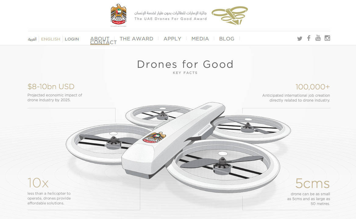 The International and National competitions of the UAE Drones for Good Award are divided into several categories: Environment, Education, Logistics, Transport, Construction and Infrastructure, Health, Civil Defence, Tourism, Social Services, Economic Development, and Humanitarian Aid. – Emirates News Agency, WAM - http://www.wam.ae/en/news/emirates/1395290792578.html