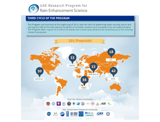 ABU DHABI, 6th April, 2017 (WAM) -- The UAE Research Programme for Rain Enhancement Science today announced that it received 201 pre-proposals for the third cycle of its innovative programme. Reflecting the programme’s growing international reputation, the number of pre-proposals for the current cycle is more than double that received last year and exceeds submissions of the first two cycles combined, as it received 201 pre-proposals from 68 countries on five continents, drawing the participation of 710 researchers, affiliated to 316 institutions. Ahmed Juma Al Za'abi, Deputy Minister for Presidential Affairs and Chairman of the Board of Trustees at the National Centre of Meteorology and Seismology, NCMS, said, "This outstanding success testifies to the UAE leadership’s determination to encourage and support the innovation needed to combat water scarcity around the world." "In the space of only a few years, the UAE Research Programme for Rain Enhancement Science has revitalised research in the important field of rain enhancement, while also driving the formation of new and productive international scientific networks. The overwhelming response to the programme’s call for pre-proposals proves that Abu Dhabi and the UAE are gaining global credibility as leaders in this field," Al Za'abi added. Also commenting on the milestone, Dr. Abdullah Al Mandoos, Director of NCMS, said, "We are immensely proud of the success achieved by the UAE Research Programme for Rain Enhancement Science in encouraging the transformative and imaginative thinking needed to solve the water security challenge. Receiving more than 200 pre-proposal submissions for its third cycle, clearly demonstrates the high esteem the programme is held in among global scientific communities. We are confident this early success will lead to the launch of exciting new projects that complement the real progress we have already achieved to date." The high uptake for the programme’s third cycle also demonstrates the growing interest in innovation and knowledge-sharing in this scientific and technical field under the directives of the UAE’s visionary leadership.