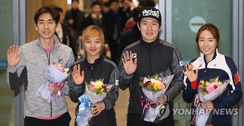 South Korean speed skaters return home on Feb. 16, 2016, after their stellar performances at the International Skating Union (ISU) World Single Distances Speed Skating Championships in Russia. Lee Seung-hoon (L) grabbed the gold in men's mass start, his first world title. For Lee Sang-hwa (R), who won the women's 500m, it was her third world title. Kim Bo-reum (2nd from L) finished second in women's mass start, while Kim Tae-yoon finished sixth in the men's 500m. (Yonhap) (END)