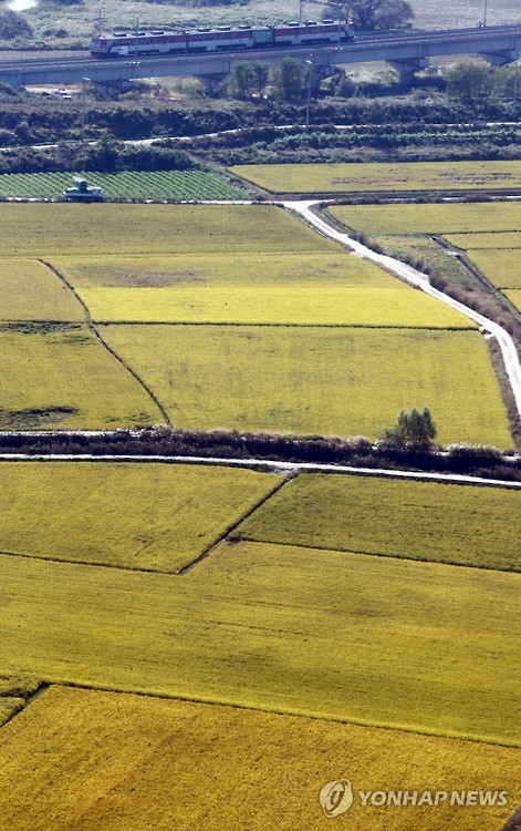 A train (upper) runs on a railway beside rice paddies in the southeastern city of Gimhae, the hometown of former President Roh Moo-hyun, on Oct. 13, 2015, as the paddies glow ahead of the rice harvesting season. (Yonhap) (END)