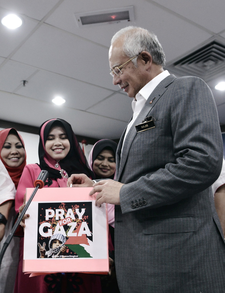 SHAH ALAM (Selangor, Malaysia) July 11 -- Malaysian Prime Minister Najib Razak launches the 'Free For Gaza' Fund before chairing a meeting with United Malays National Organisation (Umno) Selangor Badan Perhubungan (Liaisons Unit) at the Umno Selangor building here Thursday. (photoBERNAMA)