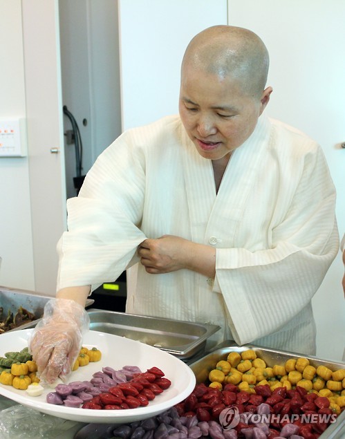 Rev. Seonjae, a Buddhist monk versed in Korean traditional temple cuisine, dishes up "songpyeon," or Korean rice cake, during a presentation at the South Korean mission to the Organization for Economic Cooperation and Development in Paris on Oct. 6, 2015, to promote traditional vegetarian cuisine of Korean temples. (Yonhap) (END)