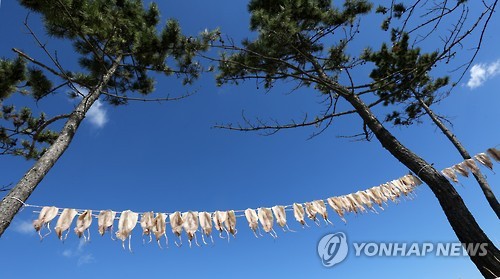 This photo taken on Oct. 12, 2015, shows squid tied on a line with pine trees used as poles, as fishermen dry the fish in the sun in the port city of Gangneung on South Korea's east coast. Dried squid is a popular South Korean foodstuff. (Yonhap) (END)