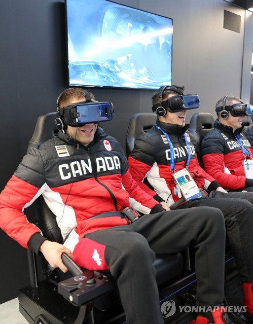 Canadian athletes enjoy virtual reality gadgets at the Olympic Village for the PyeongChang Olympics in Gangneung, Gangwon Province, on Feb. 5, 2018. (Yonhap) (END)