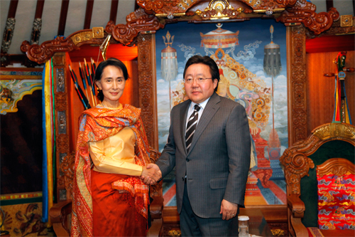 Ulaanbaatar /MONTSAME/ The President of Mongolia, Ts.Elbegdorj received Ms Daw Aung San Suu Kyi, the 1991 Nobel Peace Prize Laureate, Chairperson and General Secretary of National League for Democracy of Myanmar on April 30.