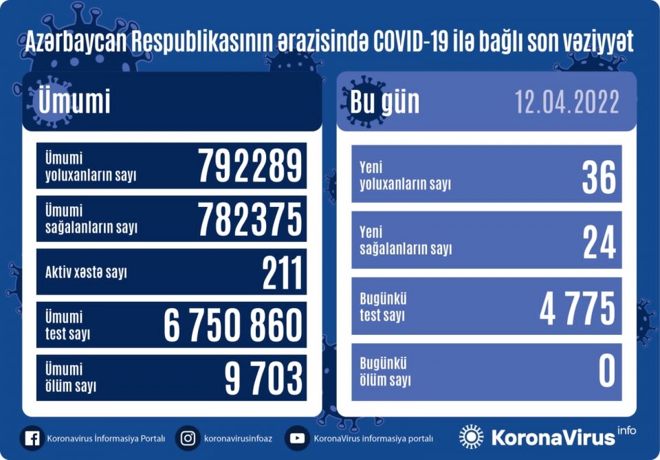 “The overall confirmed cases in Azerbaijan have reached 792,289, with 782,375 recoveries and 9,703 deaths, while treatment of 211 others is underway.