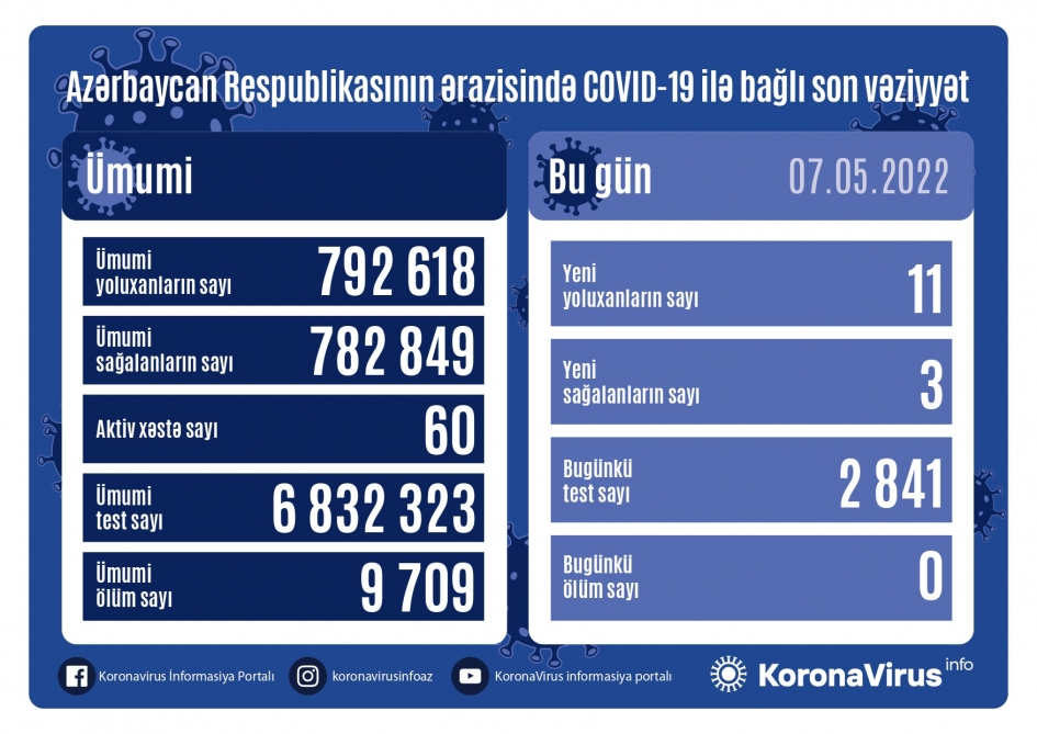 According to the Task Force, the overall confirmed cases in Azerbaijan have reached 792,618, with 782,849 recoveries and 9,709 deaths, while treatment of 60 others is underway.