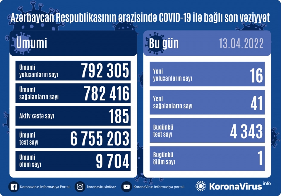 “The overall confirmed cases in Azerbaijan have reached 792,305, with 782,416 recoveries and 9,704 deaths, while treatment of 185 others is underway.