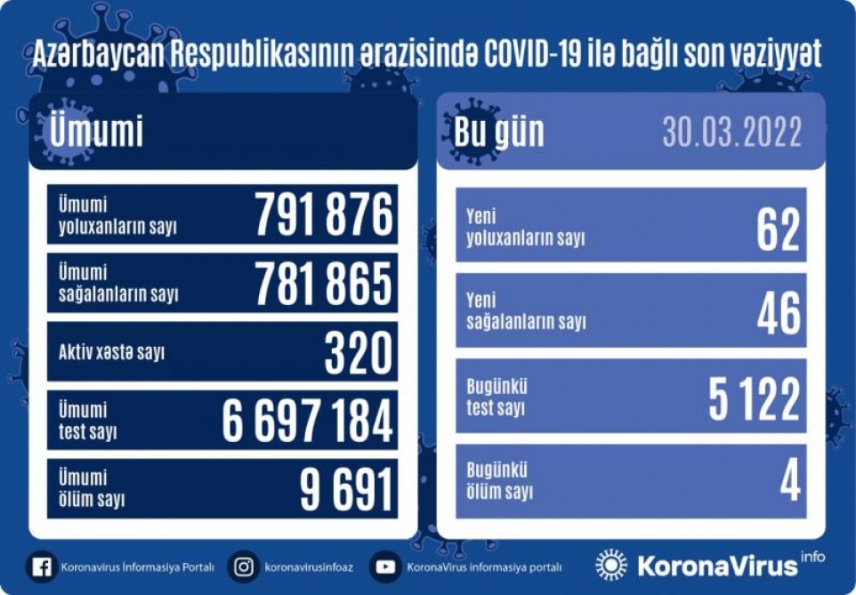 62 new cases of coronavirus infection have been recorded in Azerbaijan, while 46 patients have been recovered, the Task Force under the Cabinet of Ministers told AZERTAC.