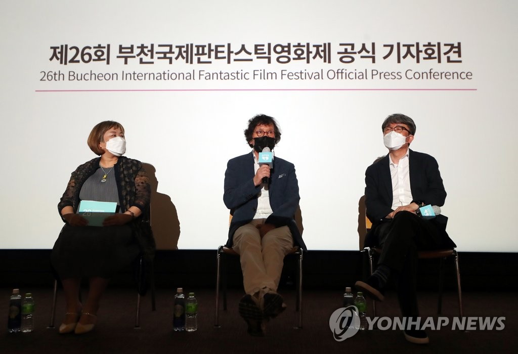 Chung Ji-young (C), chief of the 26th Bucheon International Fantastic Film Festival's organizing committee, speaks during a press conference at City Hall in Bucheon, west of Seoul, on June 14, 2022, to promote the film festival that will run from July 7-17 following a two-year hiatus due to the coronavirus pandemic. (Yonhap)