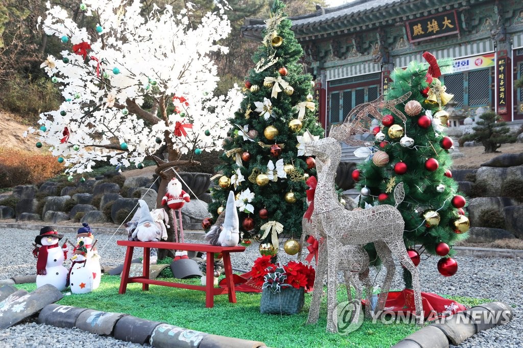 Photo This photo taken Dec. 21, 2021, shows Christmas trees decorated at the premises of Munsu Temple in Pohang, North Gyeongsang Province, southeastern South Korea. (Yonhap) (END) Log in to post comments