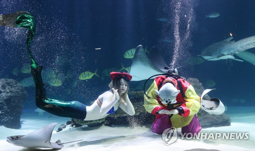 Photo A professional diver in the traditional Korean clothing "hanbok" bows inside a tank at Hanwha Aquaplanet in Seoul on Jan. 20, 2020, ahead of the Jan. 24-27 Lunar New Year holiday. (Yonhap) (END) Log in to post comments