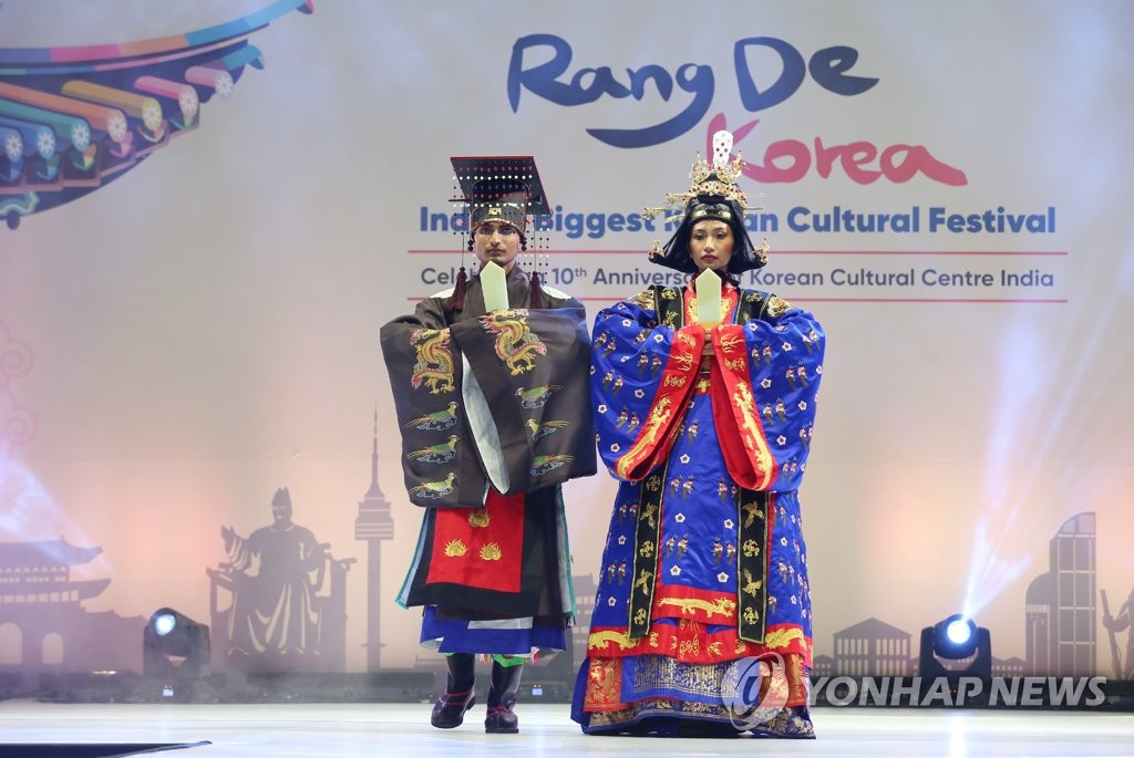 A fashion show featuring the traditional Korean costume, "hanbok," takes place in New Delhi on Oct. 15, 2022, as part of events of Rang De Korea, the biggest annual Korean cultural festival in India, in this photo provided by the South Korean cultural center there. (PHOTO NOT FOR SALE) (Yonhap)