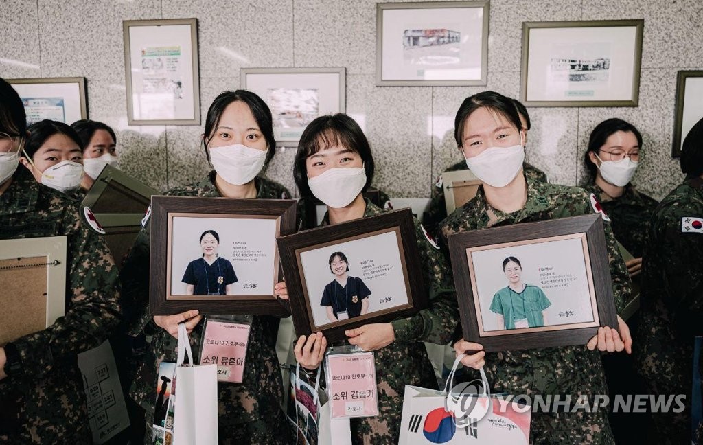 Newly commissioned military nurses hold up commemorative pictures presented by Army Chief of Staff Gen. Suh Wook, after successfully completing their first deployment to a hospital in Daegu, 300 kilometers southeast of Seoul, on April 10, 2020, in this photo provided by the military. The nurses were sent to the city to help their civilian counterparts fight the novel coronavirus outbreak. (PHOTO NOT FOR SALE) (Yonhap)